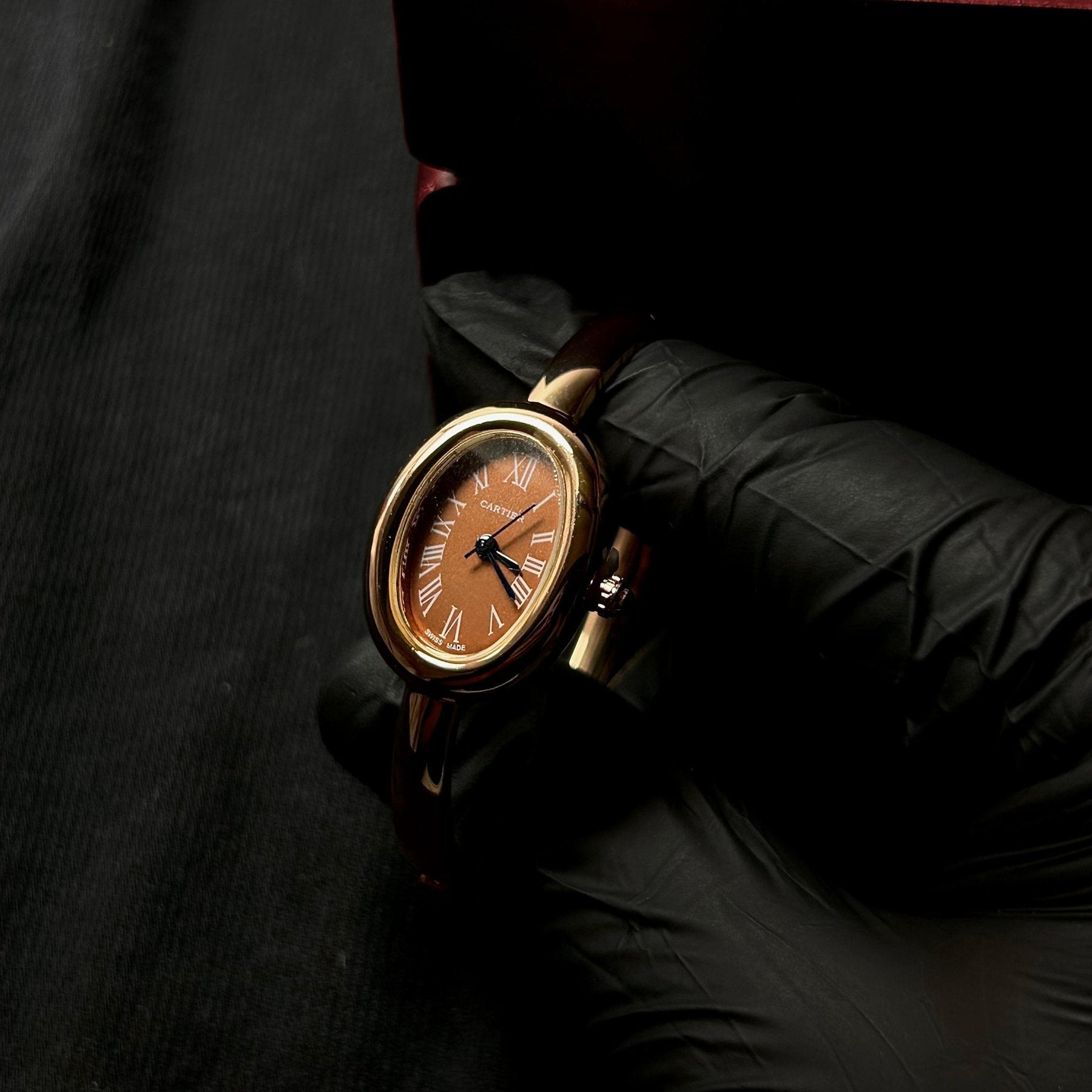 A graceful fusion of warmth and sophistication, the Cartier Baignoir WGBA0047 in Rose Gold with a Brown dial radiates timeless charm. Its refined oval silhouette, paired with Roman numerals and blued steel hands, captures Cartier’s signature elegance. A perfect choice for women who desire a luxurious watch with a touch of vintage allure and modern finesse.