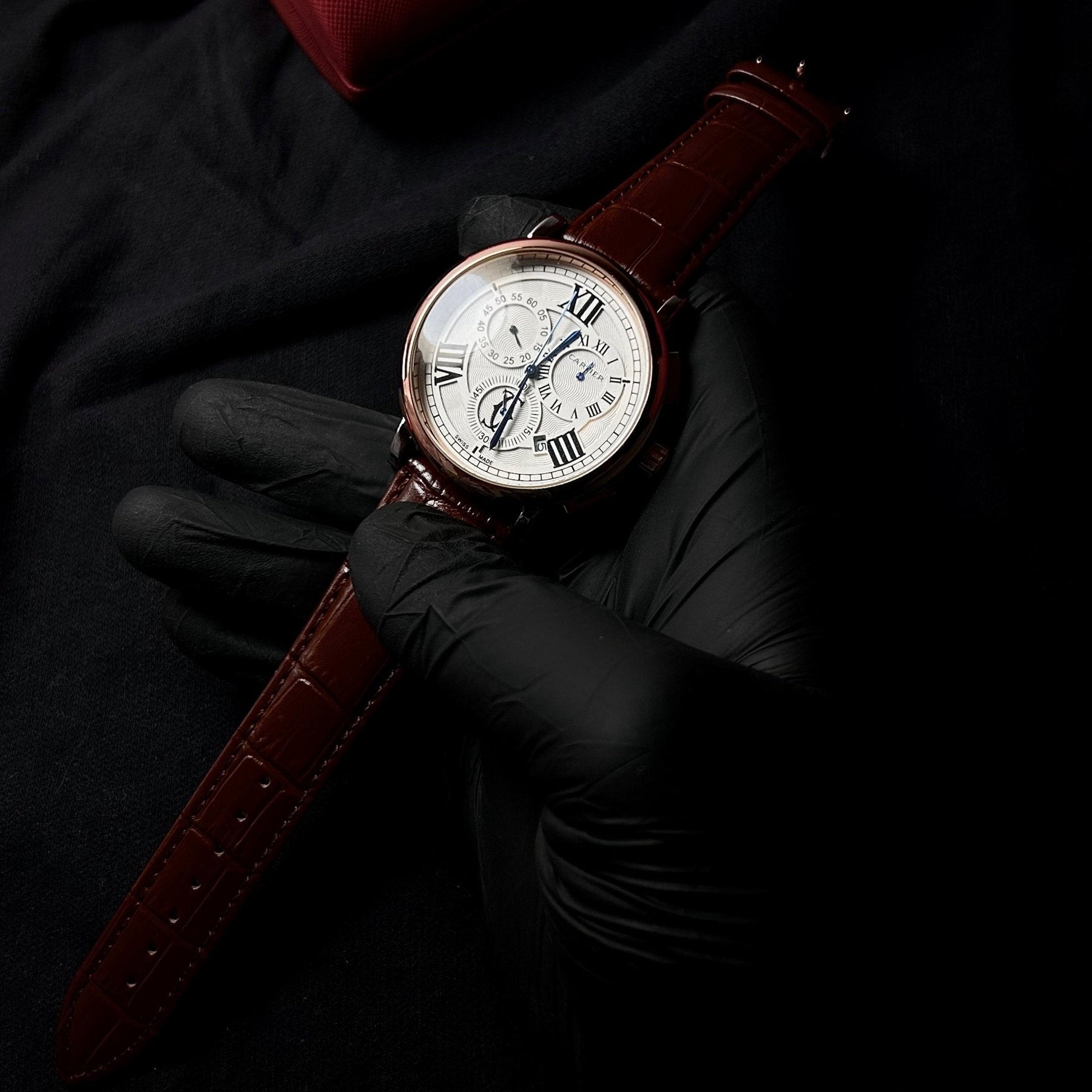 Classic elegance with a warm touch, this Drive de Cartier homage features a polished rose gold stainless steel case paired with a rich brown leather strap. The silver guilloché dial is adorned with bold Roman numeral hour markers, blued steel hands, and multi-function subdials, delivering timeless refinement with a luxurious modern appeal.