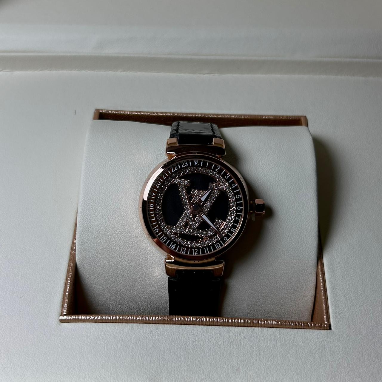 The Louis Vuitton Stellar Orbit is a captivating timepiece that embodies celestial elegance and contemporary glamour. Its black dial features a dynamic rotating LV monogram design encrusted with crystals, creating a mesmerizing play of light with every movement. Framed in a polished rose gold-tone case and paired with a glossy black patent leather strap, this watch is a statement of sophistication, perfect for both day and night wear.