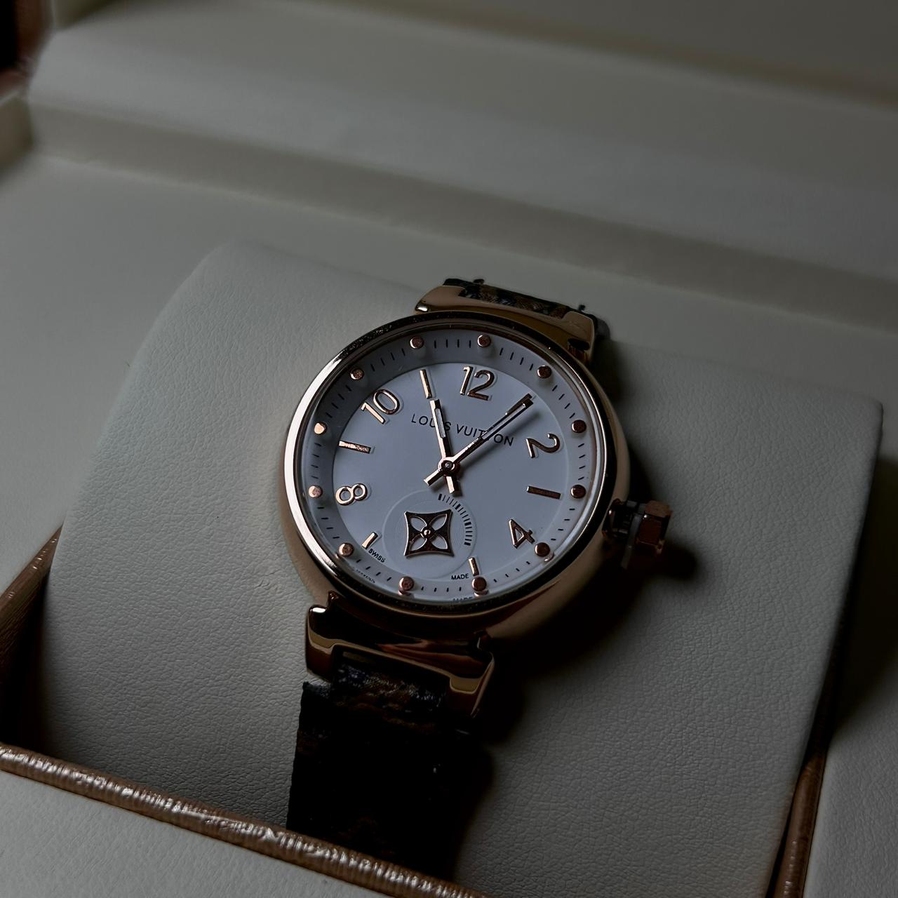 The Louis Vuitton Tambour Monogram White Dial is a graceful expression of elegance and sophistication. Featuring a polished rose gold-tone case and a crisp white dial adorned with LV’s signature monogram star motif, this timepiece combines modern refinement with timeless charm. The monogram-embossed brown leather strap adds a touch of classic luxury, making it perfect for women who appreciate subtle yet distinctive design.