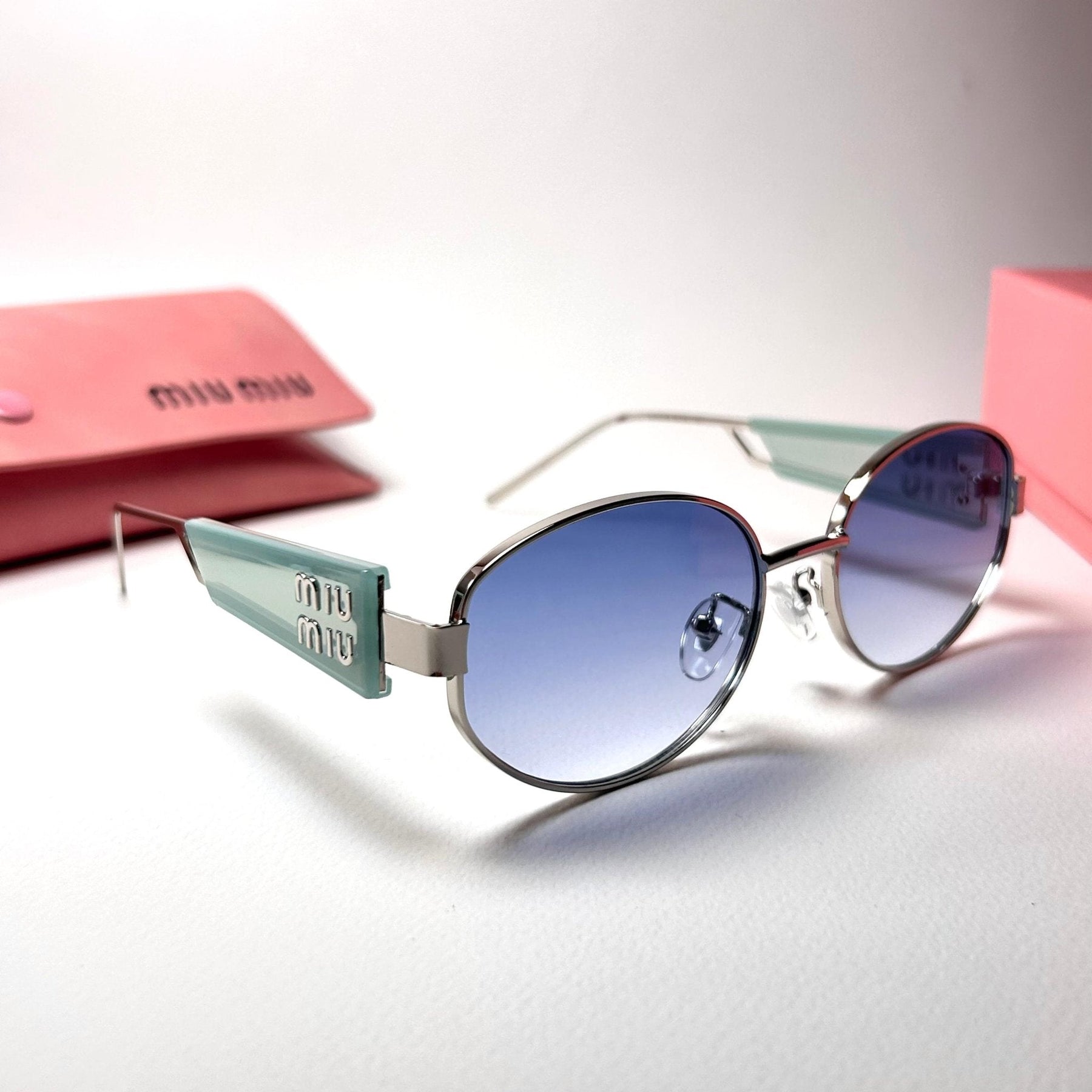 Temple Design: Wide pastel blue arms with gold Miu Miu logo