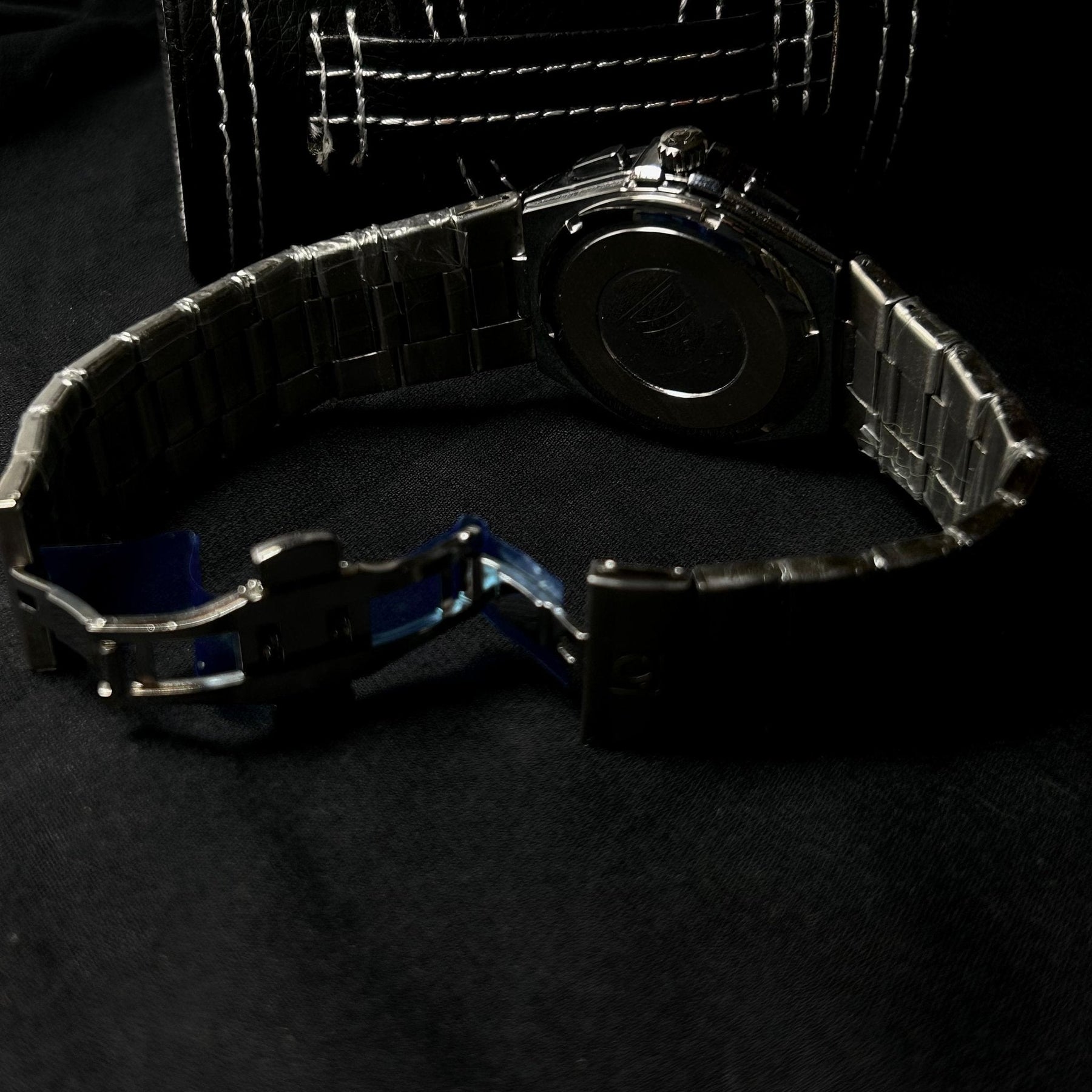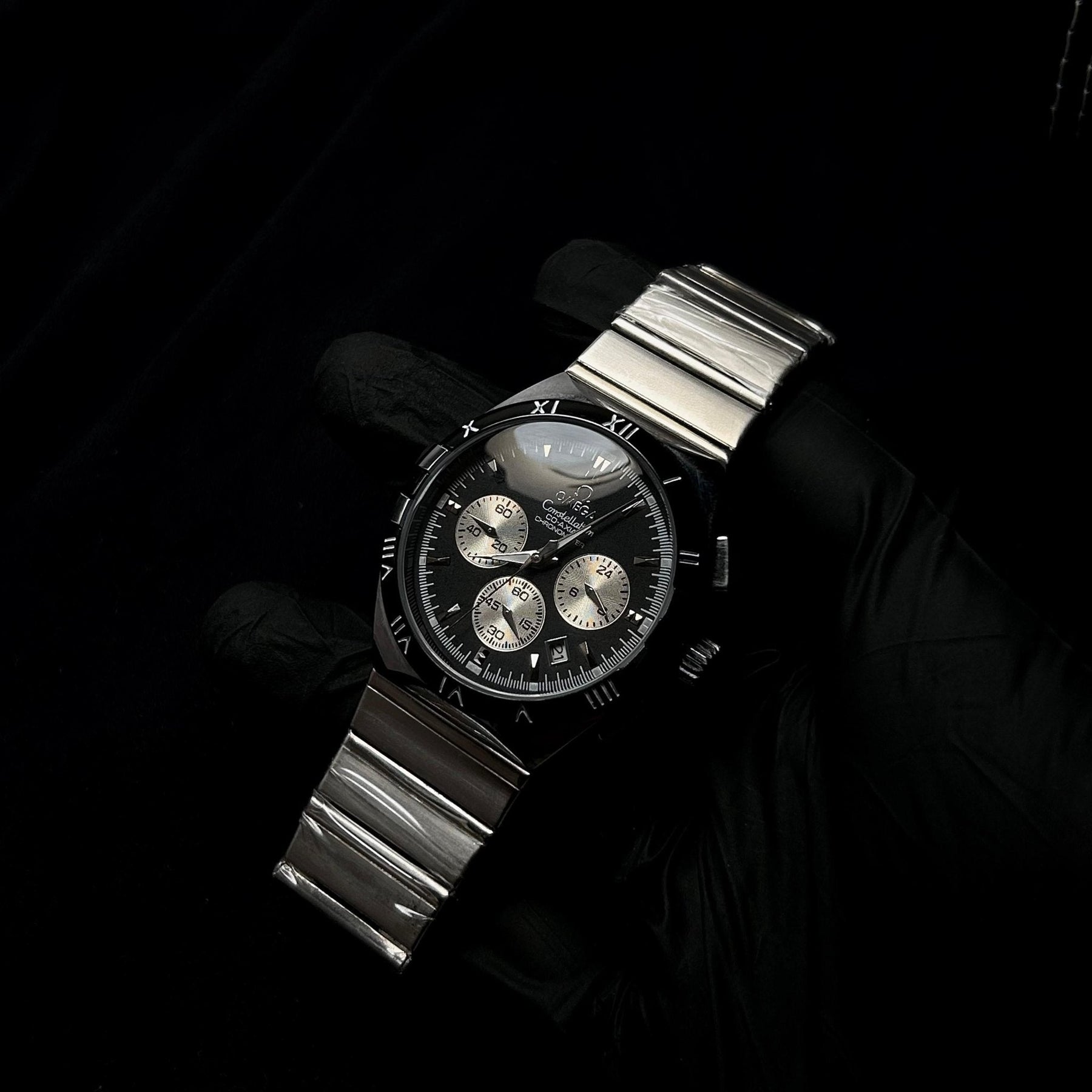 Refined and versatile, this Omega Constellation homage presents a polished silver stainless steel case and integrated bracelet, complemented by the signature Roman numeral bezel. Its black dial is balanced with silver chronograph subdials and luminous markers, creating a timeless aesthetic that merges classic heritage with contemporary precision.