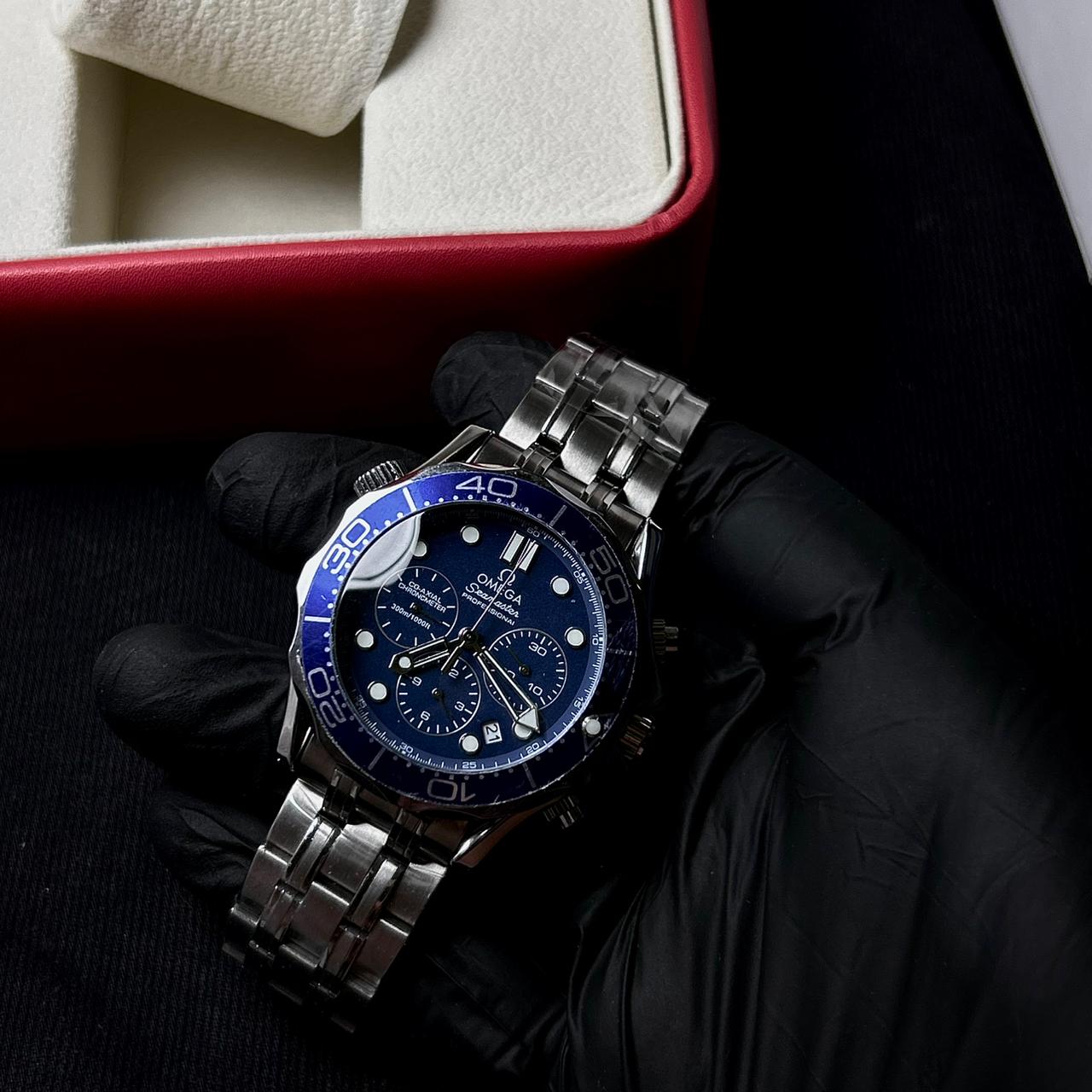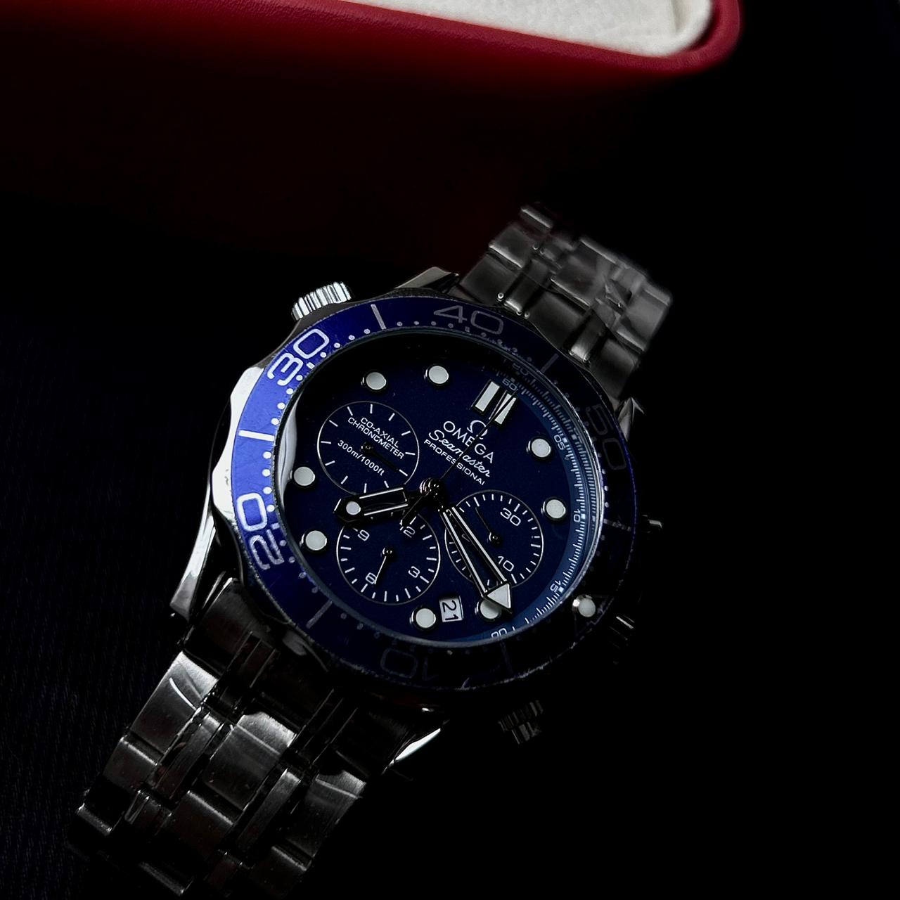Classic yet contemporary, this Omega Seamaster homage radiates nautical charm with its captivating blue dial and matching unidirectional bezel. The polished stainless steel case and bracelet reflect refined craftsmanship, while the luminous markers and chronograph subdials ensure both elegance and function. Designed for precision and confidence, it perfectly captures the spirit of oceanic adventure and timeless sophistication.