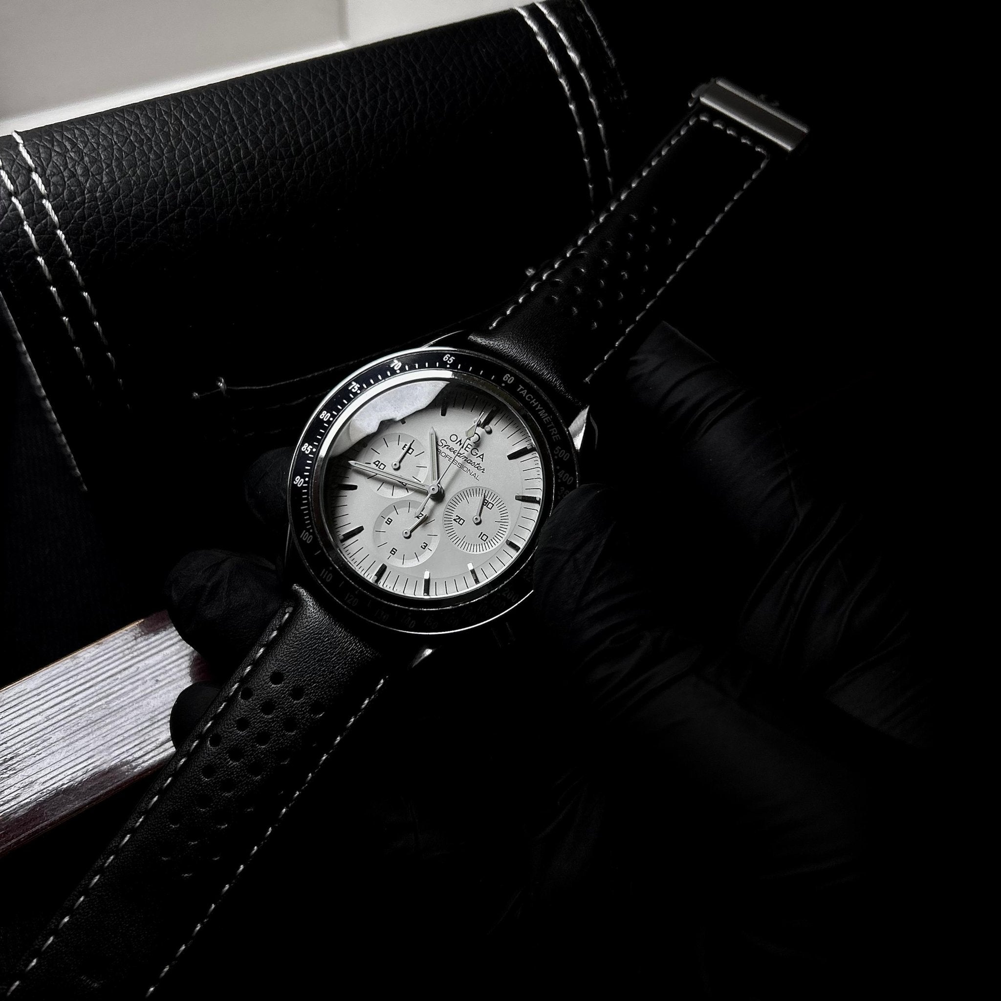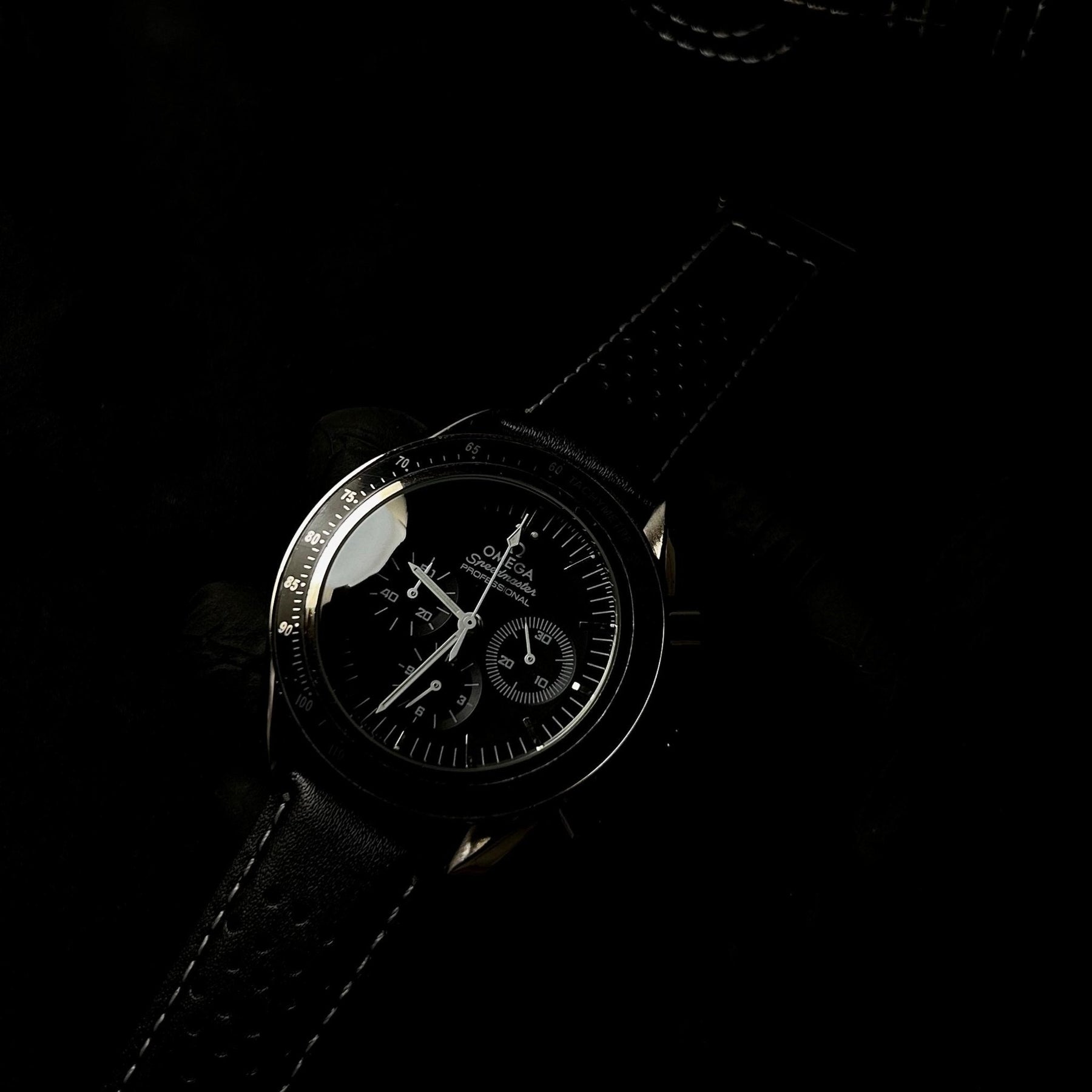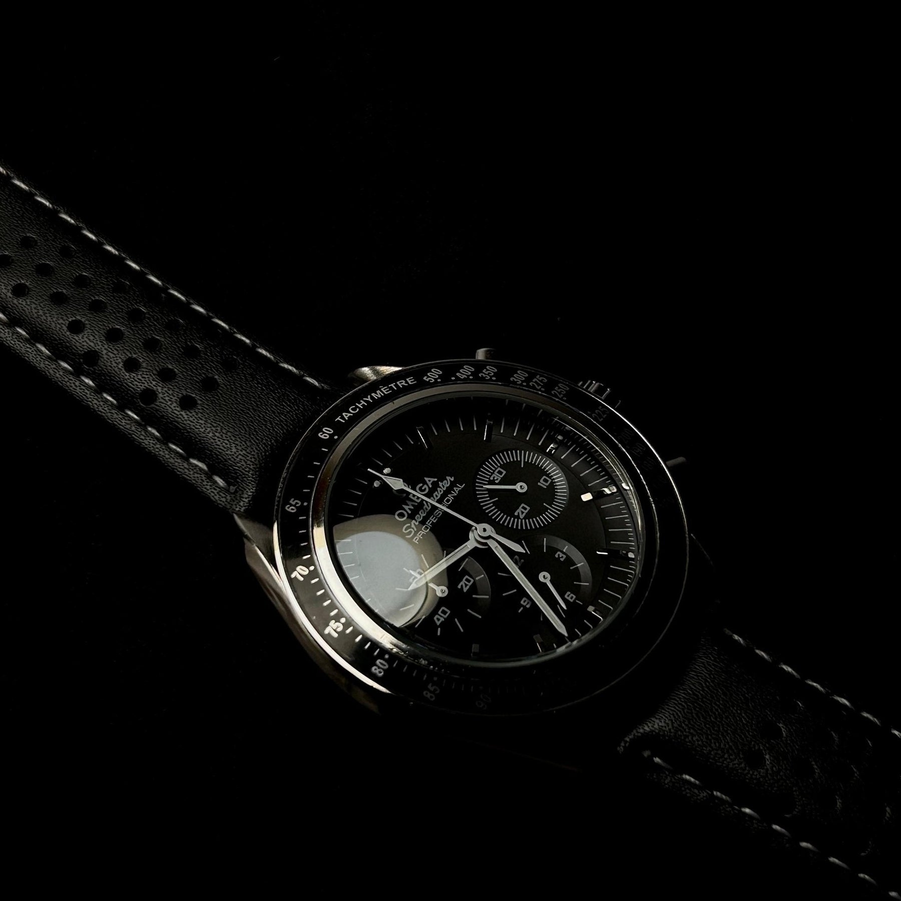 Iconic and understated, this Speedmaster Moonwatch homage features a polished silver stainless steel case and classic black tachymeter bezel. Its deep black dial presents clean white markers and contrasting chronograph subdials, paired with a sleek black leather strap—capturing the timeless spirit of the original space-era legend.