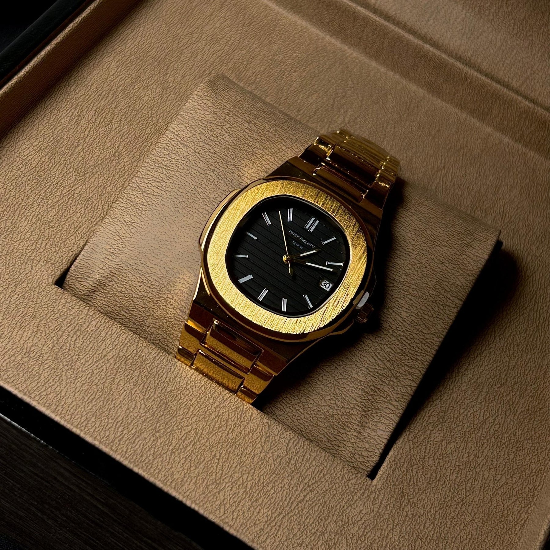Luxurious and striking, this Patek Philippe Nautilus homage for women is crafted entirely in gold-tone stainless steel with the signature rounded-octagonal bezel and integrated bracelet. The black horizontal-striped dial is elevated with gold markers and hands, alongside a discreet date display—making it a bold yet refined statement piece.
