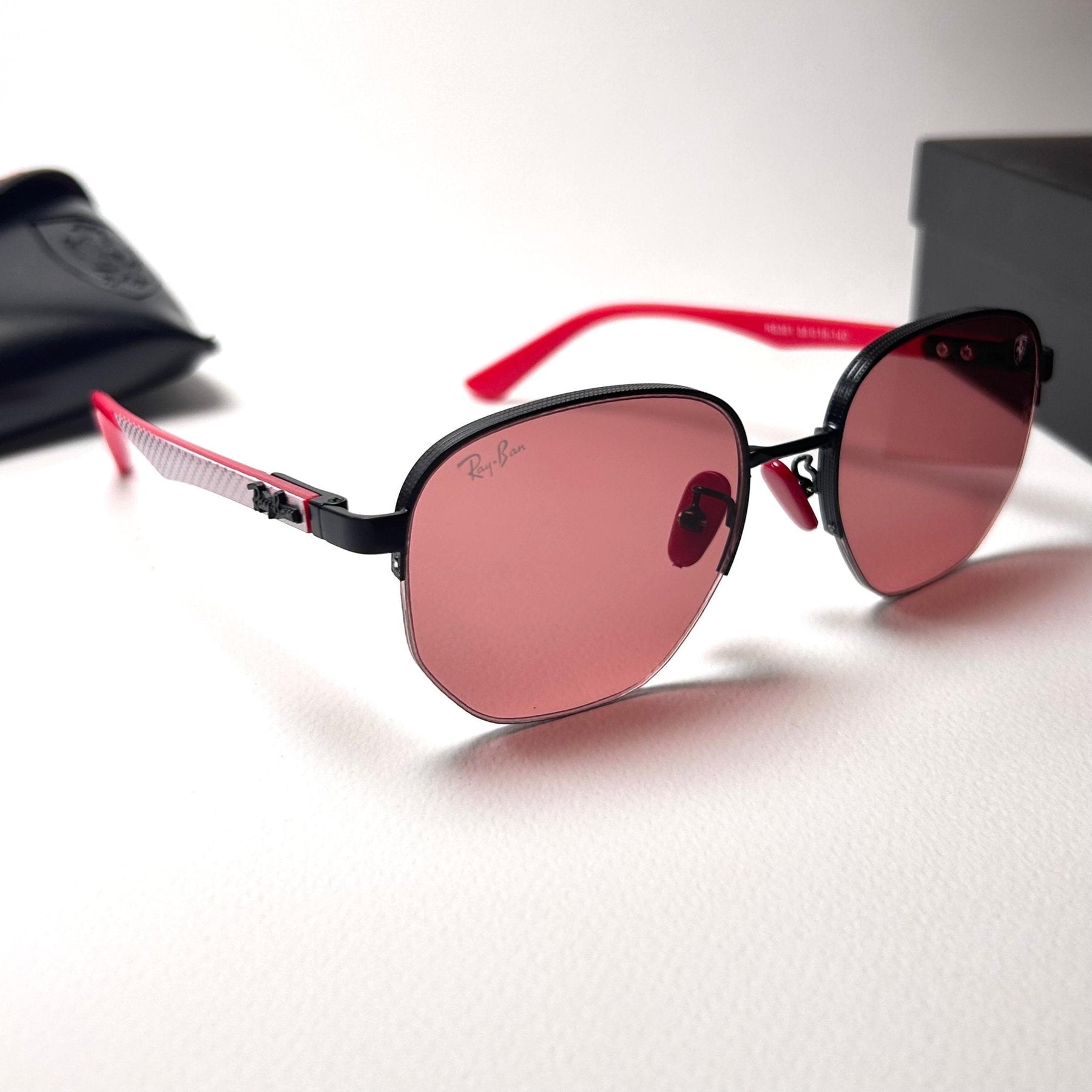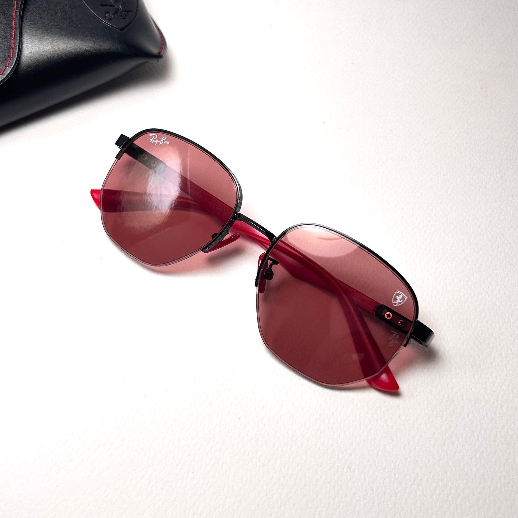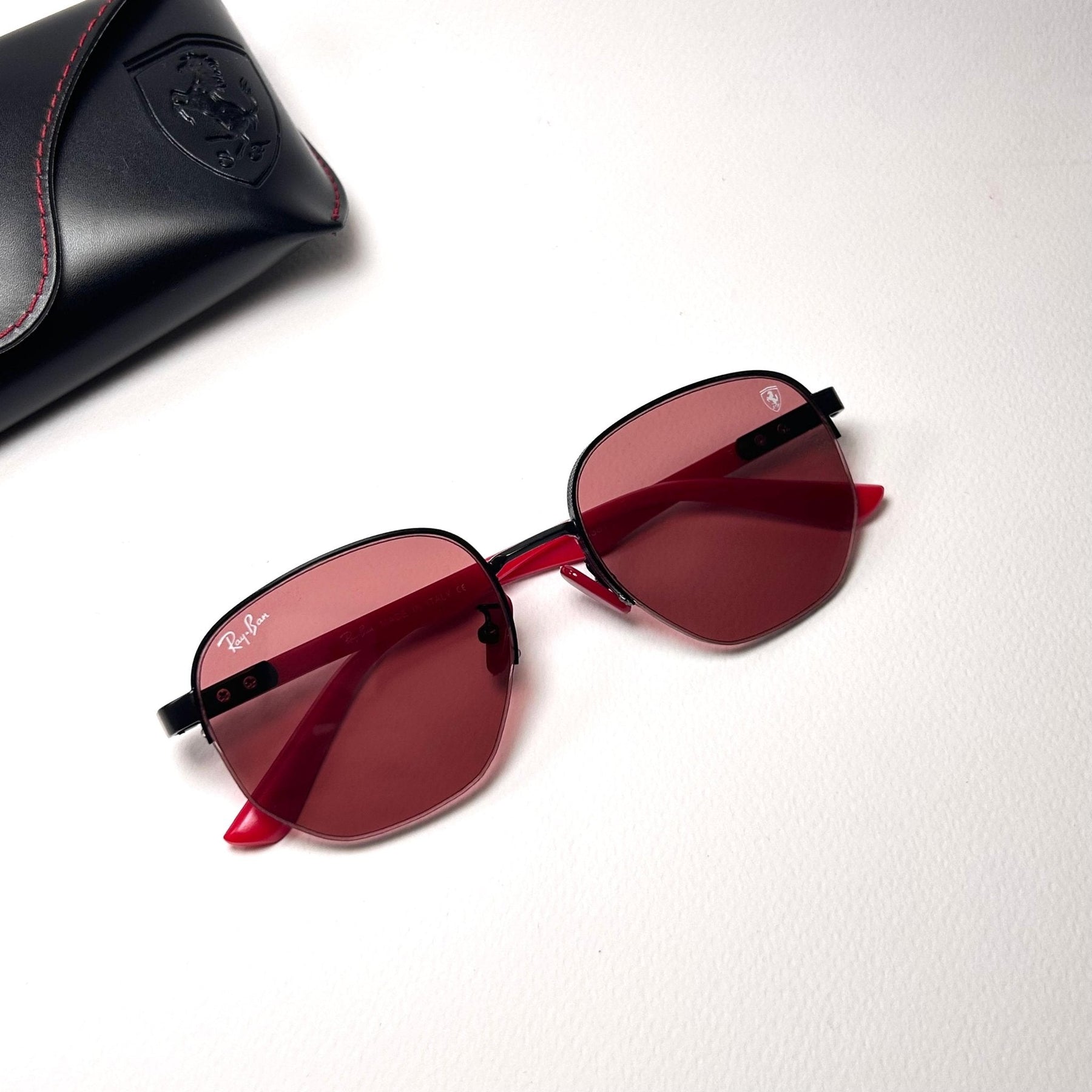 Temple Design: Slim temples with textured red detailing and Ferrari emblem