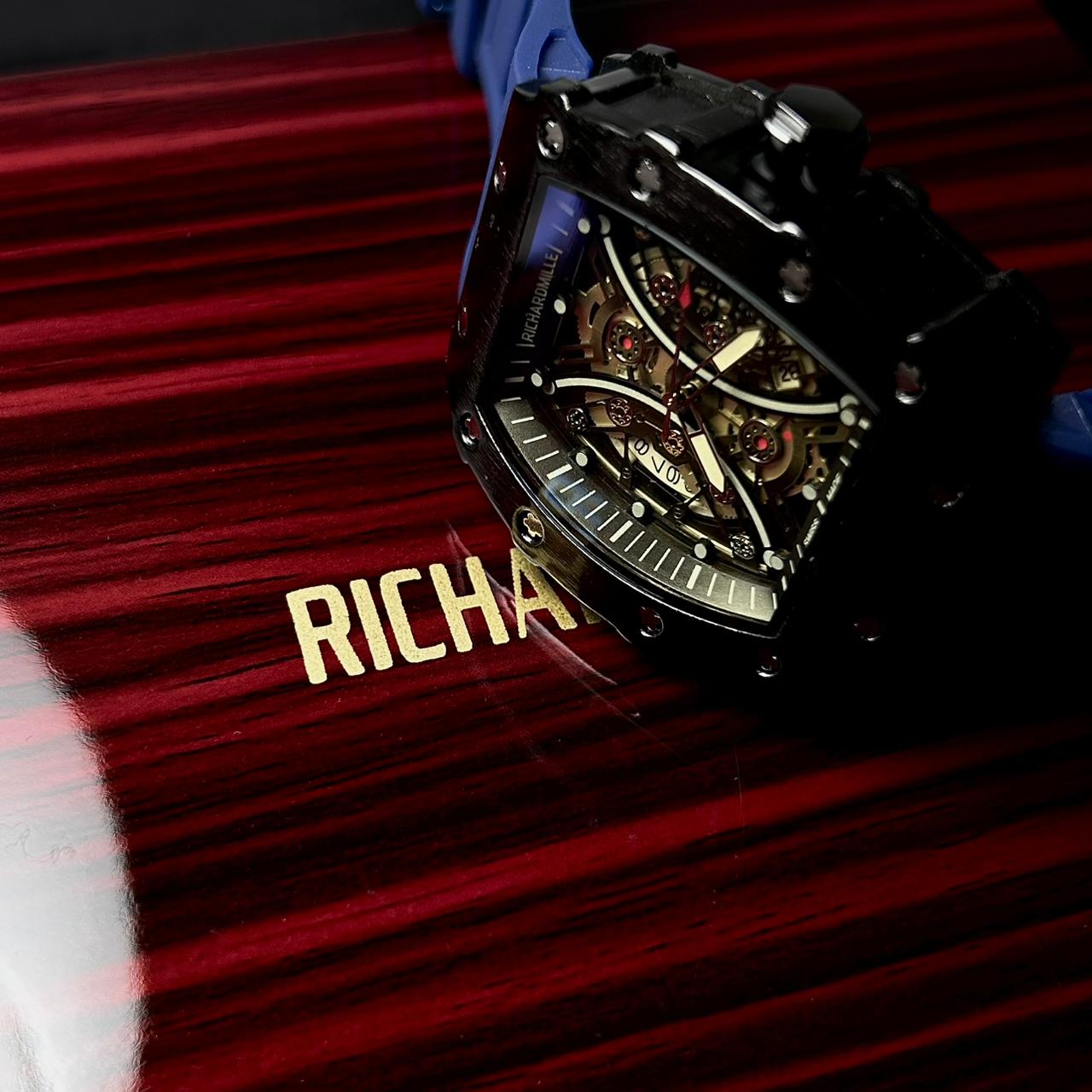 The Richard Mille RM 035 Skeleton – Navy brings together contemporary design and technical mastery. Its dark brushed tonneau-shaped case frames a mesmerizing skeleton dial that reveals the inner mechanics with golden detailing and fine craftsmanship. The navy blue rubber strap adds a refined, sporty contrast, offering comfort and durability for everyday wear. A timepiece that embodies power, precision, and avant-garde elegance.