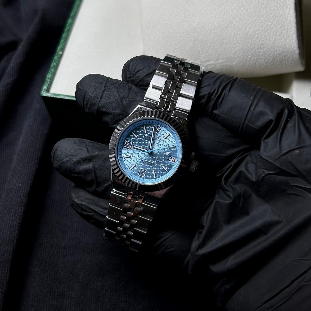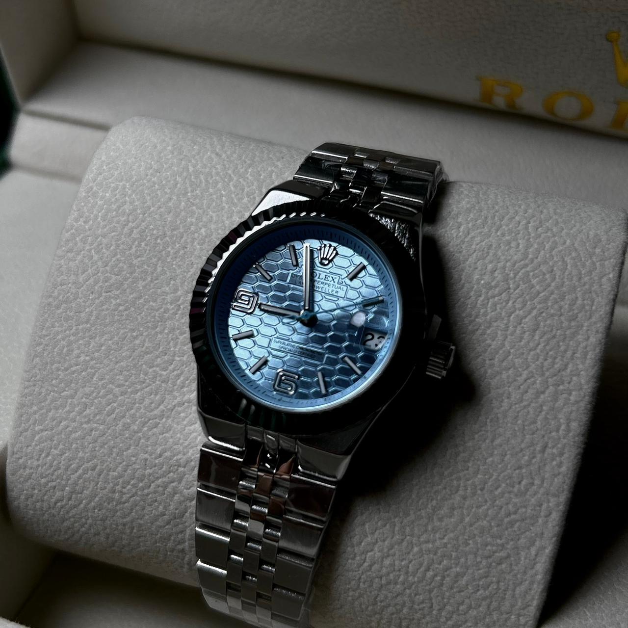 The Rolex Datejust 41 Automatic For Her – Silver Blue is a symbol of refined femininity and modern sophistication. Its radiant silver case is paired with a mesmerizing sky-blue dial featuring an embossed geometric texture that catches light beautifully from every angle. The fluted bezel adds a touch of classic Rolex elegance, while the luminous hands and Arabic numerals ensure perfect legibility. Finished with a polished stainless steel Jubilee bracelet, this timepiece is the perfect blend of grace, precision, and timeless design.