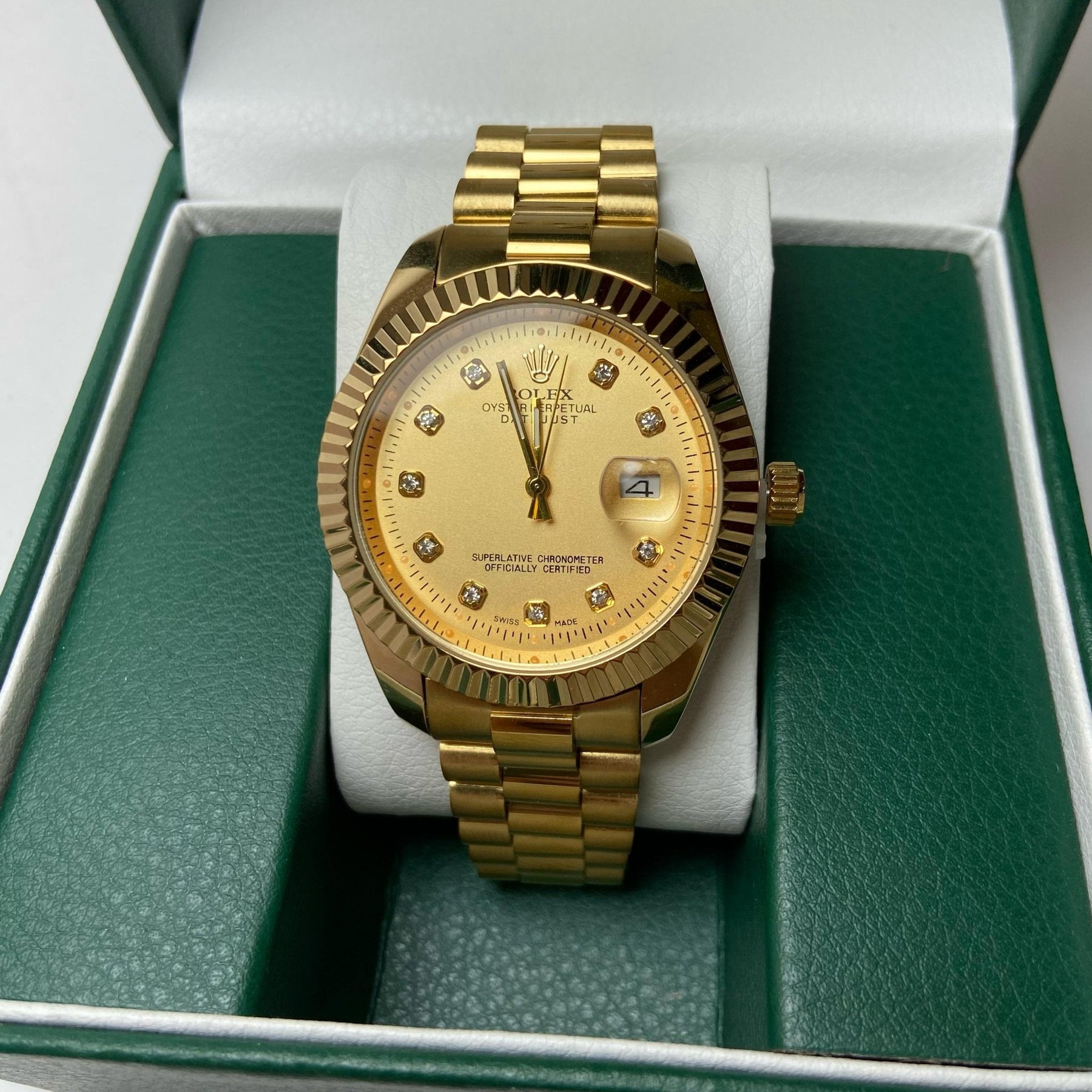 This timepiece presents a classic and elegant design inspired by the iconic Rolex Datejust. Featuring a full gold-tone finish and sparkling diamond-style hour markers, this watch offers a luxurious and eye-catching look. Powered by a precise quartz movement for reliable timekeeping.