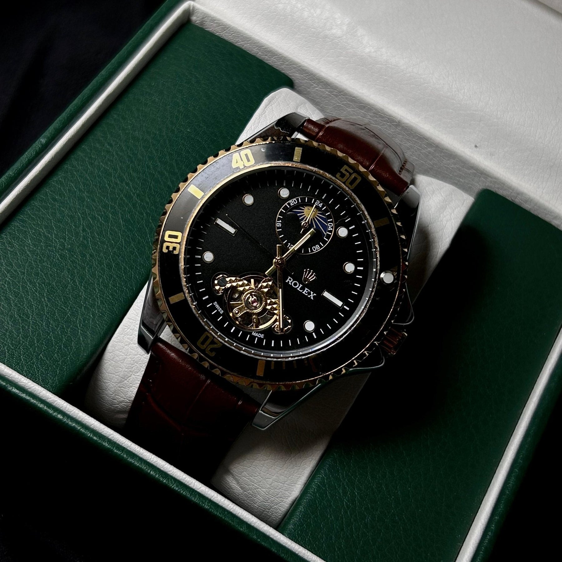 A luxurious interpretation of the Deepsea design, merging golden accents with a rich brown leather strap. The black dial is enhanced by a golden tourbillon window and moonphase sub-dial, offering a balance of elegance and technical mastery. Perfect for making a refined yet powerful statement.