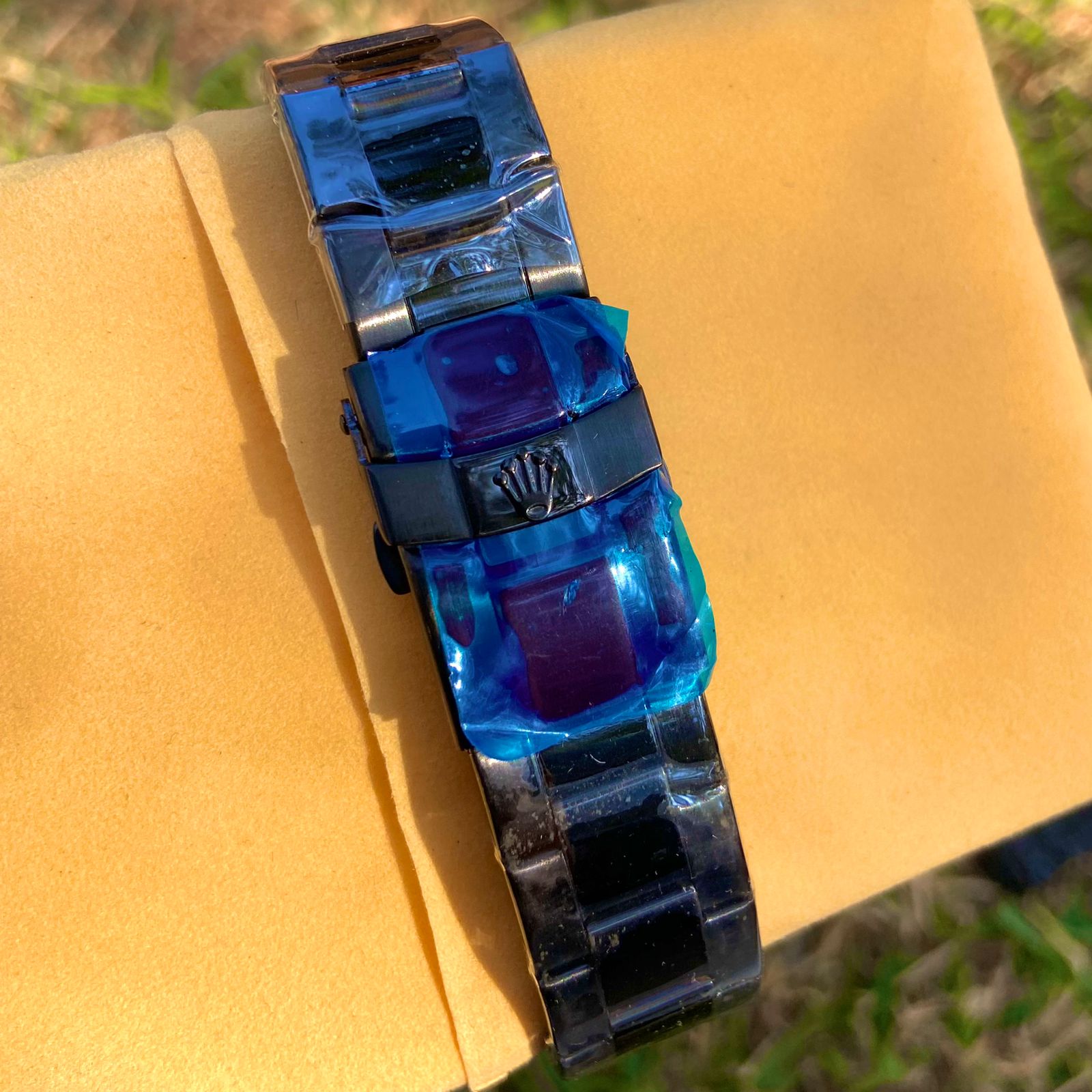 This timepiece offers a modern and customized take on the classic Rolex Datejust design. Featuring an all-black finish (case, bracelet, and dial) and unique, multi-colored hour markers, this watch has a bold and contemporary look. It's inspired by the customizations of the Blaken company. Powered by a precise quartz movement.